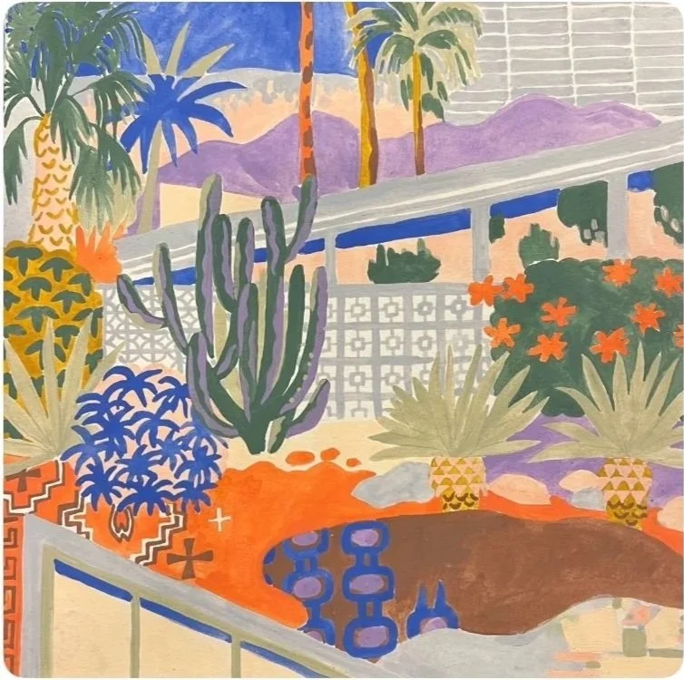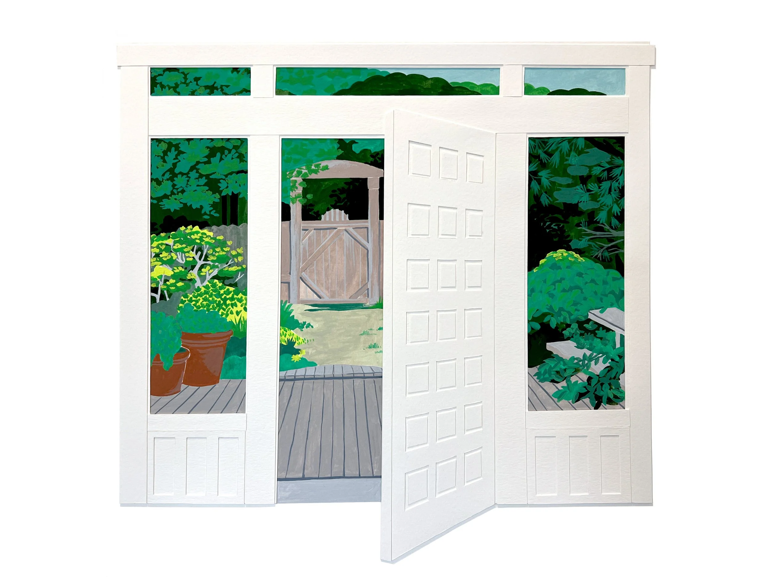 Gouache with cut paper window frames